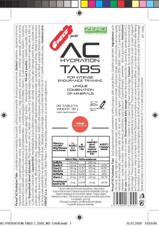 Při tréninku trvajícím déle než hodinu nebo sportovní činnosti vyšší intenzity se potem ztrácí nejen voda, ale i minerály. Podle dostupných údajů největší ztráty elektrolytů představují sodík, draslík a chloridy. V 1 litru potu se průměrně vyloučí kolem 1 g sodíku. Ztráty vápníku a hořčíku jsou výrazně nižší. Rovnováha elektrolytů má vliv nejen na zdraví, ale i na výkonnost. Denní dávka Penco® AC Hydration Tabs 4 tbl = 2 litry nápoje obsahuje 1,6 g sodíku, 0,4 g draslíku a je zdrojem, vápníku a hořčíku, které přispívají k normální činnosti svalů. Draslík je důležitý pro normální činnost nervové soustavy, podporuje činnost svalů a přispívá k udržení normálního krevního tlaku. Je obohacen vitamínem C a kyselinou pantothenovou pro snížení míry únavy a vyčerpání. Podle délky a intenzity sportovní činnosti je vhodné používat Penco® AC Hydration Tabs během výkonu v menších dávkách v intervalech 10-15 min.. Lze také kombinovat s iontovými nápoji Penco® Mineral Drink nebo Penco® Energy Drink, které navíc dodají energii.