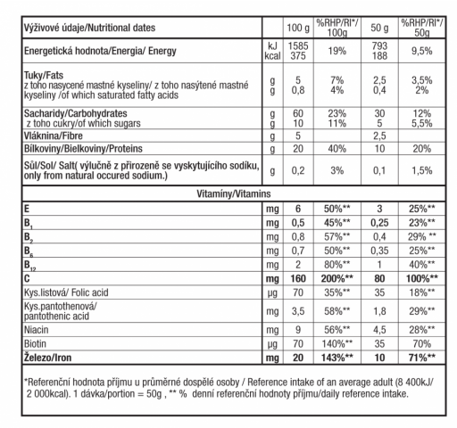 PŘÍPRAVA A DÁVKOVÁNÍ: Pro dospělé 6 polévkových lžic (50g) prášku se rozmíchá ve 150 - 200ml vody nebo mléka na kaši, pro děti od 12 let 4 polévkové lžíce (30g) ve 100 ml pro děti od 3 let 2 polévkové lžíce (15g) v 50 ml za den. Jí se budˇ ke snídani nebo 30 -120 min před výkonem. Používejte v souladu s osobním dietním plánem v množství úměrném aktuální tělesné zátěži. Pro dosažení požadovaných účinků dodržujte uvedený postup přípravy. Dbejte na různorodou a vyváženou stravu a zdravý životní styl. V případě jakýchkoli obtíží po užití kaše přerušte její užívání.