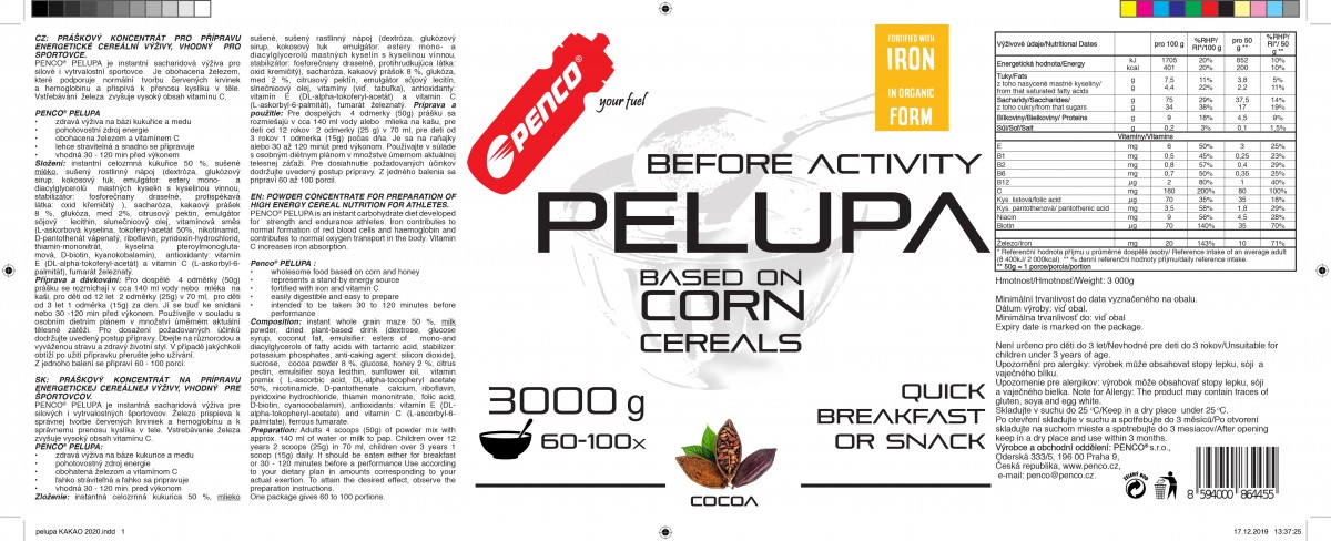 PENCO® PELUPA je instantní zdravá výživa na bázi kukuřice a medu. Poskytuje všechny potřebné živiny pro udržení výkonnosti a omezení pocitu hladu při tréninku nebo závodu. Kromě širokého spektra vitamínů a minerálních látek obsahuje plnohodnotné bílkoviny, nezbytné pro regeneraci a růst svalů, a polysacharidy, které zajišťují dodání potřebného množství energie pro zahájení nového dne. Na rozdíl od jiných podobných výrobků na našem trhu je PENCO® PELUPA výjimečná svým vysokým obsahem lecitinu.